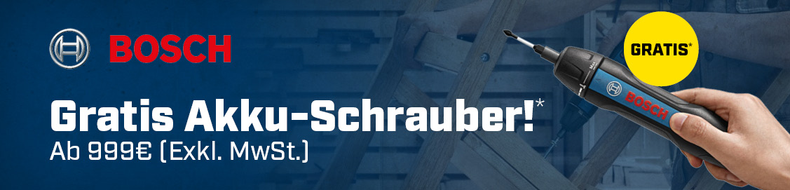 Legen Sie für mindestens €999,- (exkl. MwSt.) an teilnehmendes Bosch Werkzeug in Ihren Warenkorb uns es wird einen gratis Akku-Schrauber Set Go2.0 3.6V automatisch hinzugefügt!